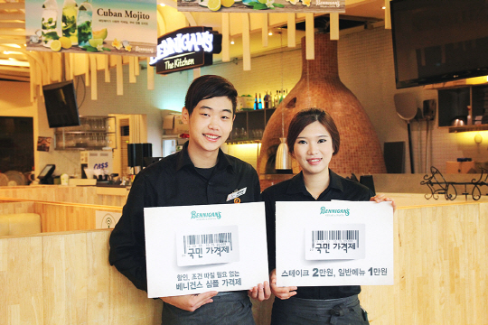 베니건스는 3일부터 베스트 메뉴를 1만원, 스테이크메뉴를 2만원으로 책정하는 심플가격제인 [국민가격제]를 9월 3일부터 실시한다고 밝혔다.
