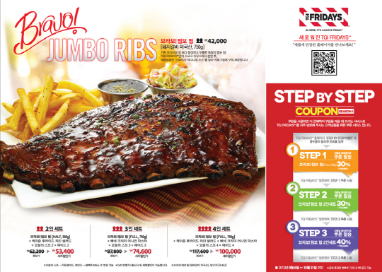 TGI프라이데이스는 신제품 출시를 기념해 오는 10월 31일까지 사용할수록 혜택이 증가하는 '스텝바이스텝(STEP BY STEP)' 쿠폰 이벤트를 진행한다. 홈페이지에 영수증 번호를 입력하면 다음 날 핸드폰으로 STEP 1 쿠폰을 전송하며, 해당 쿠폰 사용자에게 STEP 2, STEP 3 쿠폰을 순차적으로 발급한다. STEP 1쿠폰은 '브라보! 점보 립'30% 할인, STEP 2와 STEP 3 쿠폰은 각각 2인 세트메뉴를 30%, 40%씩 할인 받을 수 있다.