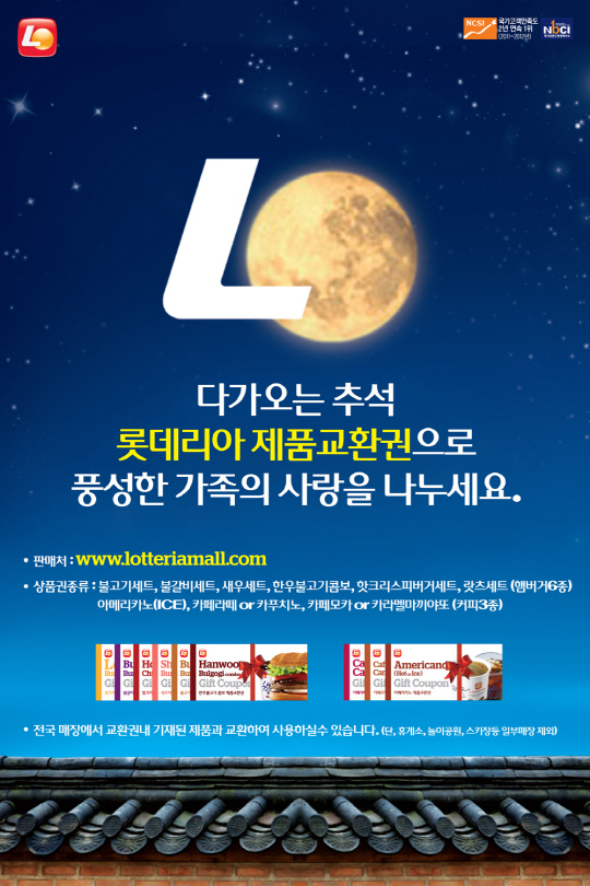 대한민국 대표 QSR(Quick Service Restaurant) 브랜드 롯데리아(대표 노일식)가 오는 17일까지 한가위 선물용으로 안성맞춤인 제품교환권을 20%할인 판매 한다.