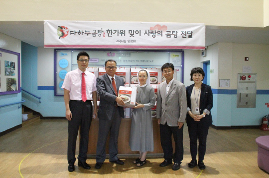 최근 곰탕, 설렁탕 프랜차이즈 사업을 본격화하고 있는 한우곰탕전문점 '다하누곰탕(www.dahanoogomtang.com 프랜차이즈 대표이사 최계경)이 11일, 고덕시립양로원을 방문해 100% 순수 한우로 달인 건강 보양식인 곰탕 600인분을 어르신들에게 전달했다.