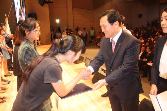 무학 좋은데이 사회공헌재단은 10일 경남도청 신관 대강당에서 열린 '제14회 사회복지의 날'을 기념행사에서 사회복지종사자 자녀 20명를 선발해 총 1천만 원을 장학금을 전달했다.