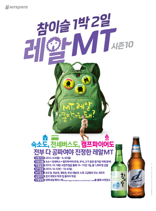 하이트진로(www.hitejinro.com)가 전국 대학생을 대상으로 '참이슬 1박2일 레알MT시즌10'의 참가자를 모집한다.