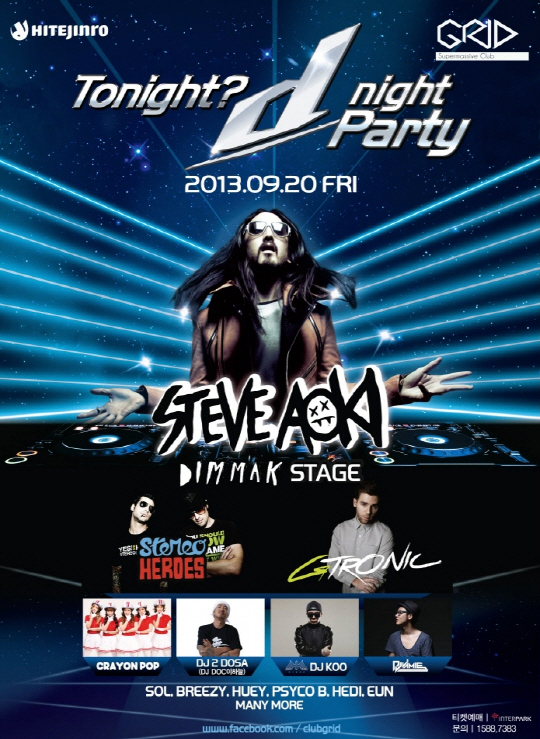화려한 디제잉과 퍼포먼스로 '파티몬스터'라는 애칭으로 불리 우고 있는 세계적인 아티스트 스티브아오키의 내한 공연이 펼쳐지며, DJ KOO(구준엽), DJ 2 DOSA(이하늘), DJ 제이미 등 국내 유명 DJ들이 총 충돌해 클럽 파티의 진수를 보여줄 예정이다.