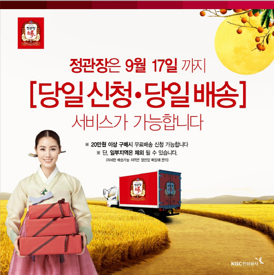 KGC인삼공사는 정관장 매장에서 홍삼제품을 구매 시 무료로 당일 배송해주는 '당일신청·당일배송' 서비스를 추석 연휴 전날인 17일까지 실시한다고 밝혔다.