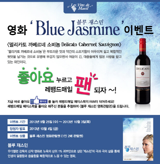 와인수입전문기업 ㈜레뱅드매일(대표 유지찬)에서 수입하고 있는 '델리카토 까베르네 소비뇽'이 '우디앨런'의 영화 '블루 재스민'의 공식 와인으로 선정된 것을 기념하여 페이스북 이벤트를 실시한다.