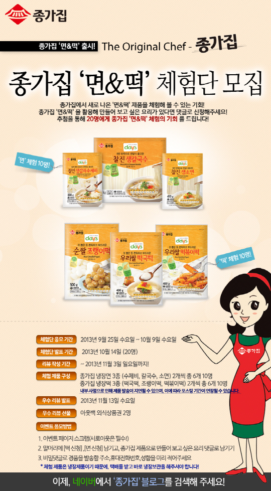 체험단이 요리할 제품은 갓 뽑은 듯 쫄깃한 맛이 일품인 떡국떡, 조랭이떡, 떡볶이 떡으로 구성된 '종가집 냉장떡 3종'과 수제비, 칼국수, 소면으로 구성된 '종가집 냉장면 3종'이다. 선정된 체험단은 종가집 제품을 활용한 요리 레시피와 맛에 대한 반응 등 신제품에 대한 의견과 시식 후기를 작성해 개인 SNS에 소개하고 종가집 메일(chefzzong_@naver.com)로 제출하면 된다. 이 중 우수 후기를 선정해 아웃백 외식상품권 등을 제공할 예정이다.