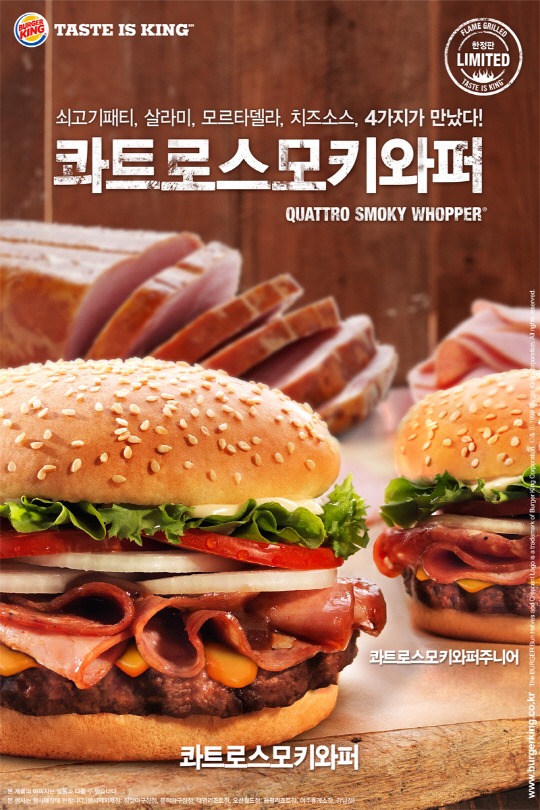 버거킹 마케팅팀 관계자는 "이번에 출시되는 '콰트로스모키와퍼'는 버거킹 메뉴 중 처음으로 스모크햄을 활용한 제품으로 체다 치즈크림, 스파이시 BBQ소스 등 토핑들의 절묘한 맛의 조화가 일품이다."라며 "버거킹은 앞으로도 소비자들의 입맛에 맞는 다양한 제품 개발에 힘쓸 것."이라고 밝혔다.
