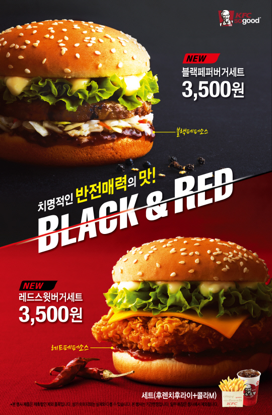 KFC(www.kfckorea.com)가 가격은 낮추고 맛은 업그레이드한 '반전 매력'의 '블랙&레드 버거' 신메뉴를 오는 18일까지 선보인다.