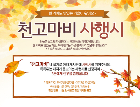 참여 방법은 해당 이벤트 게시판에 들어가 '천고마비' 네 글자로 사행시를 작성해 남기면 된다. 톡톡 튀는 재치가 돋보이는 사행시를 선정해 총 3명에게 다하누 명품 한우를 경품으로 제공하며 당첨자는 11월 초 이벤트 게시판을 통해 고지될 예정이다.