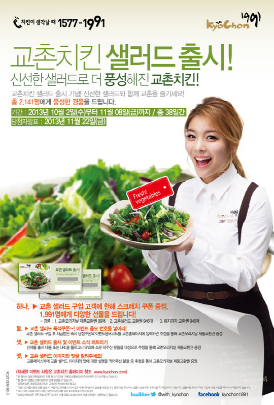 교촌에프앤비㈜는 '신선한 샐러드로 더 풍성해진 교촌치킨!'이라는 컨셉으로 10월 2일부터 11월 8일까지 38일간 총 2,141명을 대상으로 경품제공 이벤트를 실시한다.