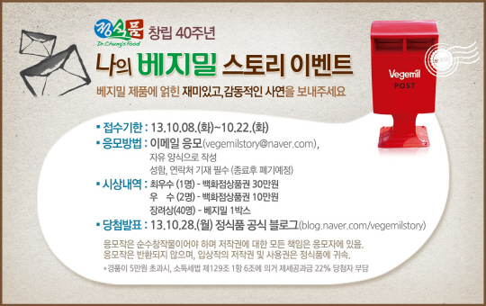 이번 이벤트는 1973년 대한민국 최초의 두유 베지밀을 개발한 정식품이 창립 40주년을 기념해 마련한 고객 감사 행사로, 베지밀 제품에 얽힌 사연이 있다면 누구나 참여 가능하다. 이벤트 참여 방법은 이메일(vegemilstory@naver.com)로 베지밀 제품에 얽힌 재미있고 감동적인 사연을 자유형식으로 작성해 보내면 응모가 완료되며, 이메일 접수 시 성함과 연락처를 꼭 기재해야 한다.