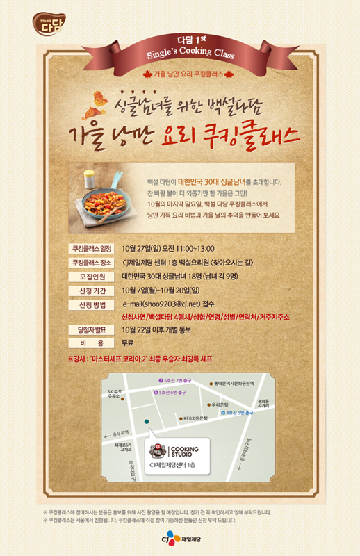 CJ제일제당(대표 김철하) 찌개양념 브랜드 '백설 다담'은 천고마비의 계절 가을을 맞아 외로운 30대 싱글 남녀를 대상으로 '백설 다담과 함께하는 가을 낭만 쿠킹클래스'를 개최한다.