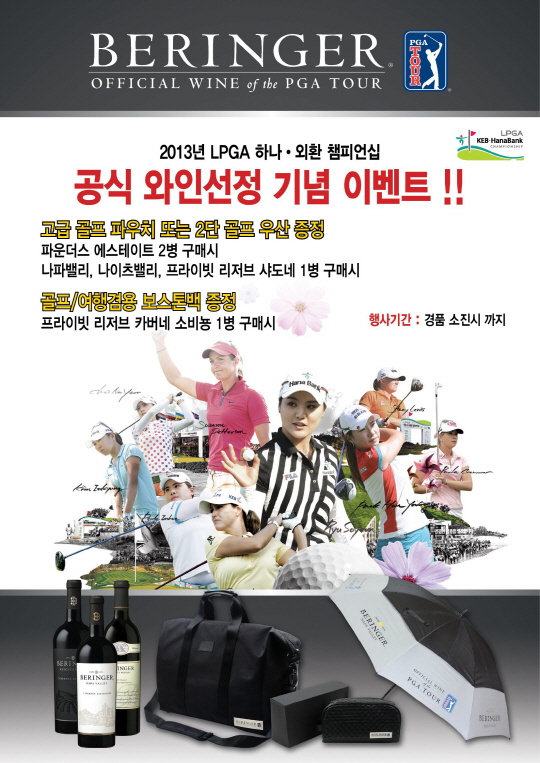 롯데주류(대표 이재혁, www.lotteliquor.com)가 'LPGA 하나-외환 챔피언십' 대회 공식 와인인 '베린저' 이용 고객을 대상으로 15일부터 골프대회 초대권과 골프용품을 증정하는 소비자 이벤트를 개최한다.