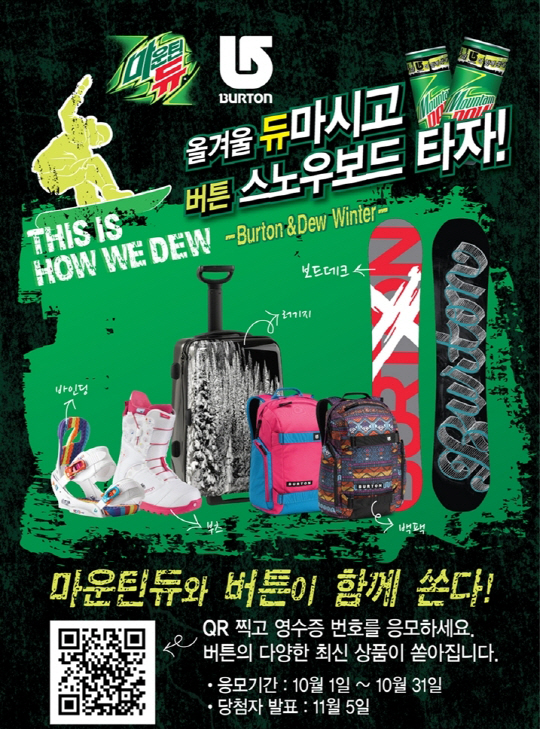 롯데칠성음료가 오는 31일까지 '마운틴듀' 붐업 조성을 위해 스노보드 브랜드 '버튼(BURTON)'과 제휴 이벤트를 갖는다.