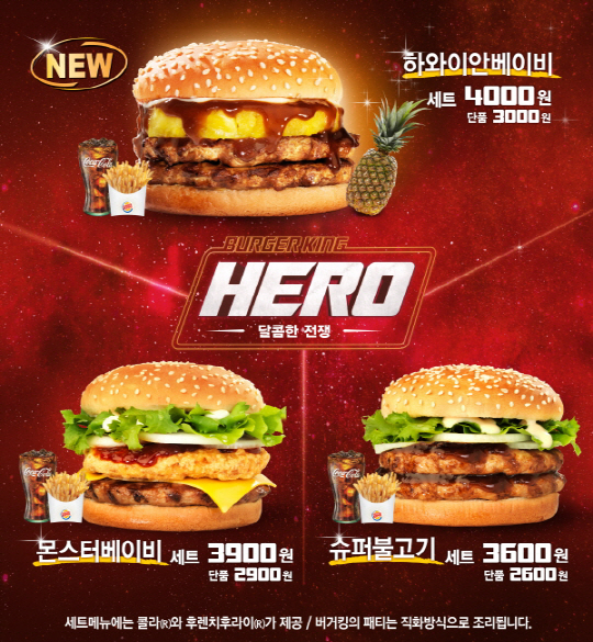 특히 '히어로 시즌2'를 통해 처음 선보인 '하와이안베이비'는 소비자들에게 큰 인기를 끈 '하와이안버거'를 토대로 히어로 버전으로 다시 탄생한 메뉴로 상큼한 파인애플, 매콤한 BBQ 소스가 직화로 구운 패티와 어우러져 매콤달콤한 맛이 일품이다. '몬스터베이비'는 전에 출시된 '몬스터와퍼'의 미니멀 사이즈 제품으로 패티, 양상추, 치즈, 양파 등의 푸짐한 토핑에 쫄깃한 치킨 패티까지 구성되어있어 풍성한 맛을 자랑하며, '슈퍼불고기'는 더블 패티와 한국인 입맛에 딱 맞는 달콤한 불고기 소스의 감칠맛이 식욕을 자극한다. '히어로 시리즈'는 매 시즌마다 제품을 달리하여 지속적으로 출시될 예정이다.