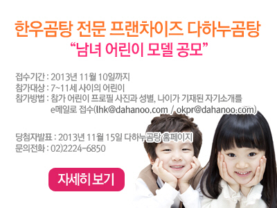 곰탕, 설렁탕 가맹 사업을 본격화하고 있는 한우곰탕 전문 프랜차이즈 '다하누곰탕 (www.dahanoogomtang.com 대표이사 최계경)이 가맹모집 시작과 함께 다하누곰탕의 이미지를 대표할 남녀 어린이 모델을 선발한다.