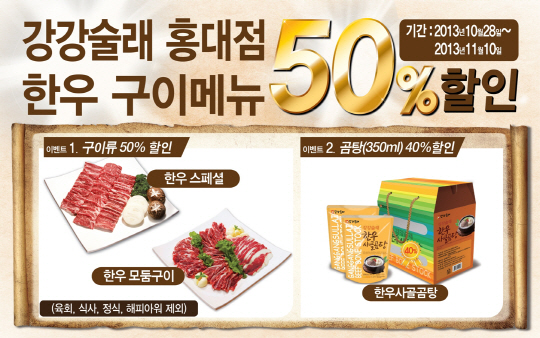 강강술래 홍대점은 내달 10일까지 한우모둠구이, 한우스페셜 메뉴 등 모든 구이메뉴를 50% 할인 판매한다. 또, 매장 인기메뉴인 술래양념·한돈양념·돼지양념 포장상품 1+1 행사도 함께 벌인다.
