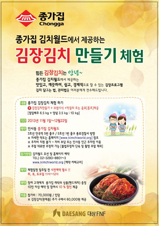 김장에 서툴거나 부담을 느끼는 소비자를 대상으로 진행되는 이번 프로그램은 좋은 김장 재료를 고르는 법부터 김치를 담그는 전 과정과 관리법까지 김장에 관한 상세한 강의가 진행된다. 이와 함께 종가집 절임배추(6.5Kg)와 김치 양념(3.5Kg)을 이용해 직접 김장김치 담그기 실습이 함께 진행된다.