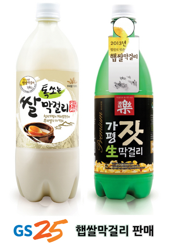 이달부터 판매를 시작하는 햅쌀 막걸리는 GS25 전용 막걸리인 '친구처럼톡쏘는쌀막걸리'(950ML,1800원)와 NB상품인 우리술가평잣생막걸리'(750ML, 1600원)다.