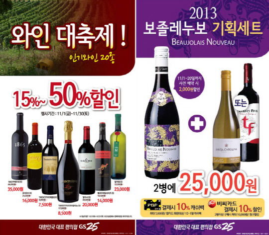 GS25는 보졸레누보와 화이트와인인 산타캐롤라이나샤도네 또는 레드와인인 TWENTYFIVE까쇼로 구성된 기획세트를 2만5천원에 판매하며, 이달 20일까지 사전 예약한 고객은 2천원 할인 혜택을 누릴 수 있다.