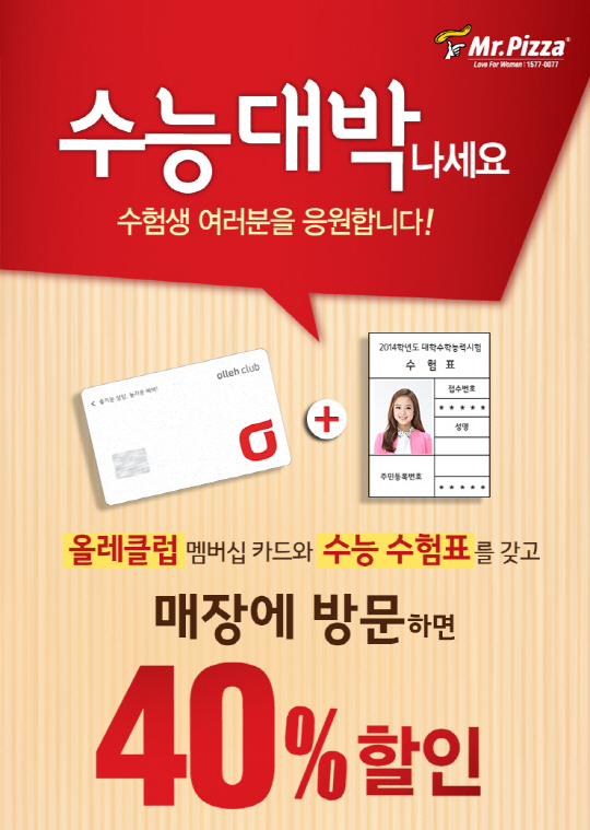 글로벌 외식문화기업 MPK그룹이 운영하는 미스터피자가 수능시험이 열리는 7일부터 10일까지 4일간 '대학 수학능력시험 기념 KT 40% 할인 프로모션'을 실시한다.