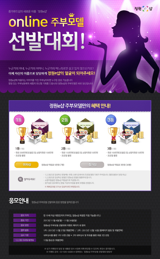 만 19세 이상의 대한민국 주부라면 누구나 참가가 가능하며, 모델로 선발된 최종 3명에게는 상금은 물론 정원e샵 적립금 형태로 쇼핑 지원금이 지급된다.