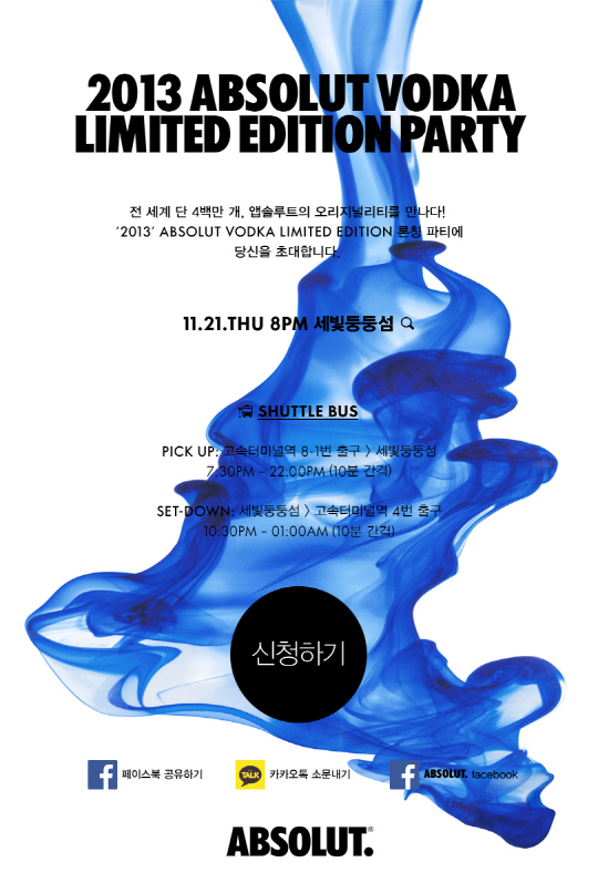 참여를 원하는 이들은 19일까지 앱솔루트 공식 페이스북(www.facebook.com/ABSOLUTKOREA)을 통해 신청 가능하며, 추첨을 통해 파티 참여 기회를 제공한다. 파티에 대한 자세한 정보는 공식 페이스북을 통해 확인 가능하다.