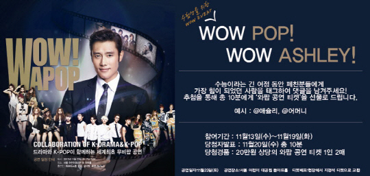 아메리칸 그릴 & 샐러드 애슐리는 수험생에게 와팝 공연 티켓을 선물로 증정하는 페이스 이벤트를 오는 19일까지 진행한다고 밝혔다.이번에 진행되는 이벤트는 수능이라는 긴 여정을 준비하면서 가장 많이 힘이 됐던 사람을 댓글로 남기고 그 사람을 태그해주는 페이스북 이벤트이다. 응모방법은 애슐리 페이지에서 '좋아요'를 누른 후 댓글을 달면 된다. 총 10명을 추첨해 1인 2매씩 총 20명에게 와팝 공연 티켓을 선물로 증정한다. '공유하기'를 하면 당첨 확률은 더욱 높아질 수 있다.