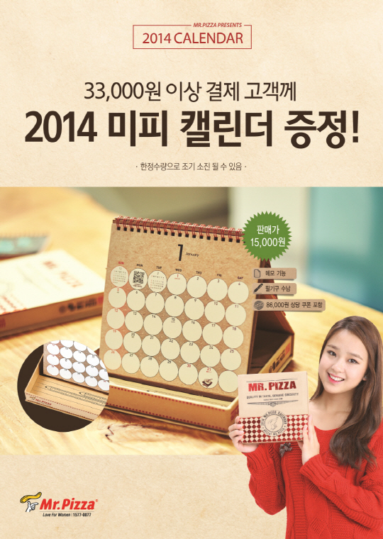 미스터피자가 2014년 캘린더에 할인쿠폰을 담아 증정 이벤트를 실시한다. 사진제공=미스터피자