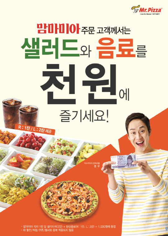 '미스터피자 맘마미아 주문하면 샐러드, 음료는 1000원.'