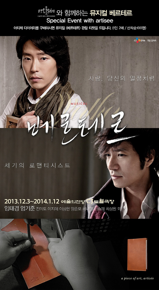 유러피안 라이프스타일 카페 아티제(www.cafeartisee.com)가 프리미엄 다이어리 구매 고객들에게 뮤지컬 '베르테르' 티켓을 선착순으로 증정한다.