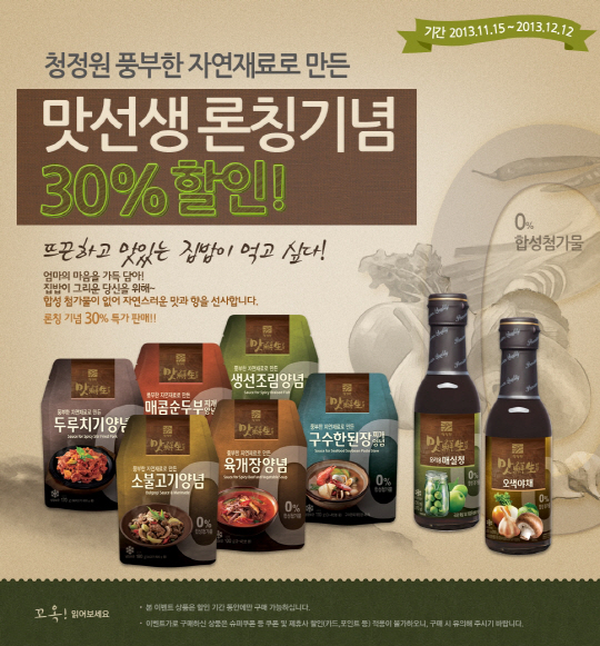 이번에 할인 판매되는 대상품은 최근 새롭게 냉장 타입으로 선보인 맛선생 8종의 신제품이다. 야채로 맛을 낸 액상 조미료 '맛선생 오색야채'와 '맛선생 매실청', 찌개양념, 고기양념 등 6종류의 '맛선생 한식양념'이 할인 대상이다.