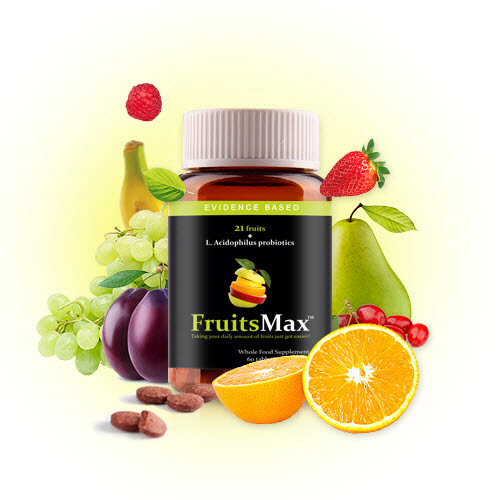 '푸르츠맥스'는 미국 완제품으로 21가지 과일을 동결 건조해 다양한 과일을 한 번에 섭취할 수 있는 제품이다.