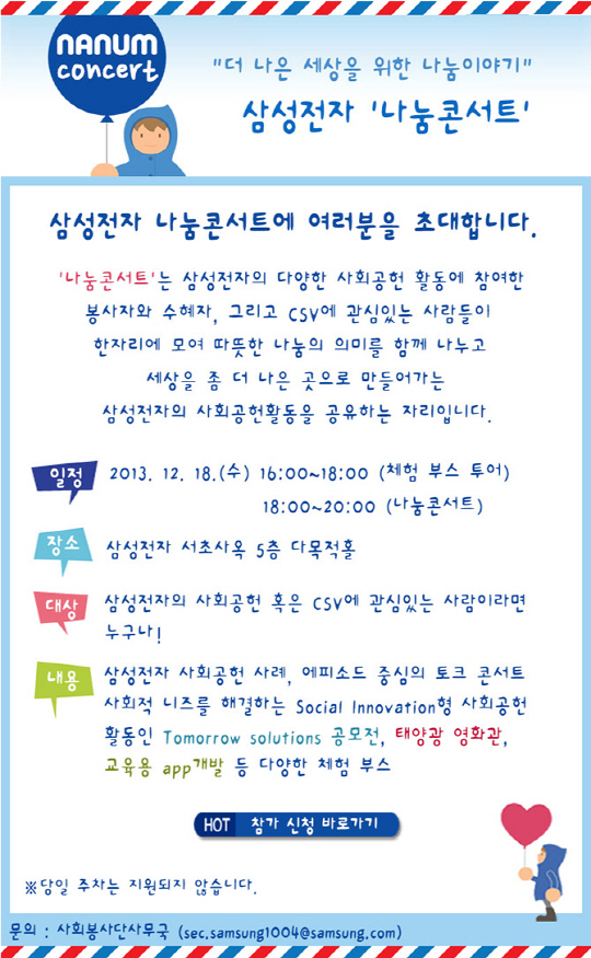 지난해 시작한 '나눔콘서트'는 한 해 동안 사회공헌 활동에 참여한 삼성전자 임직원, 수혜 학생과 교사, NGO, CSV(Create Shared Value·공유가치창출)에 관심있는 사람들이 한자리에 모여 삼성전자의 다양한 사회공헌 활동 내용과 결과를 공유하는 자리다.