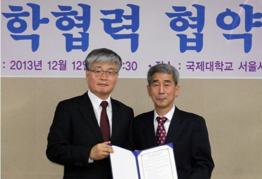 장기원 국제대학교 총장(왼쪽)과 김상국 강강술래 사장이 산학협력 협약식을 맺고 있다. 사진제공=강강술래