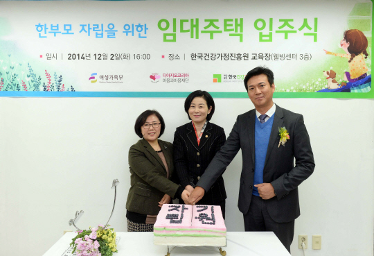한국건강가정진흥원 이은희 원장, 여성가족부 김희정 장관, 디아지오코리아 조길수 대표(왼쪽부터)가 12월 2일 마포구 한국건강가정진흥원에서 열린 한부모 여성가정 임대주택 지원 개소식에서 기념 케익을 컷팅하고 있다.