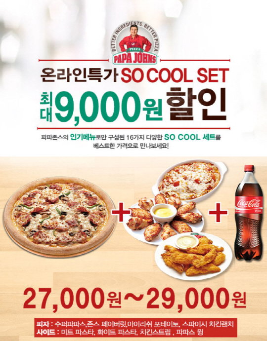 할인 대상 제품은 파파존스의 인기 피자인 수퍼파파스, 존스 페이버릿, 아이리쉬 포테이토, 스파이시 치킨랜치 등 4종과 미트 파스타, 화이트 파스타, 치킨 스트립, 파파스윙 등 인기 사이드메뉴 4종으로 구성됐다. 총 16가지의 다양한 세트메뉴를 최대 9000원 할인된 가격에 구매할 수 있다.