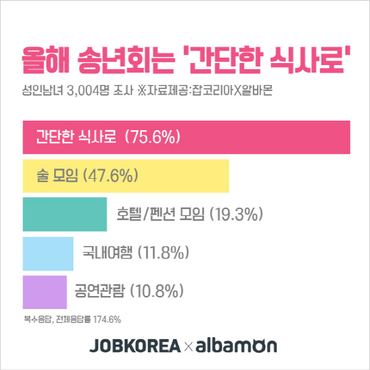 '송년회를 어떻게 보낼 계획인가'란 설문에 복수응답으로 조사한 결과 '간단한 식사를 할 것'이라는 응답자가 75.6%로 가장 많았다. 다음으로 '술자리를 가질 것'이라는 응답자가 47.6%로 많았다. 이어 호텔·펜션 등에서 모임(19.3%)을 갖거나, 국내여행(11.8%), 공연관람(10.8%)을 계획하는 이들이 많았다.