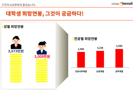 성별에 따라 희망 연봉이 달랐는데 남학생은 3573만원, 여학생은 3009만원으로 집계돼, 564만원 가량의 격차를 보였다.