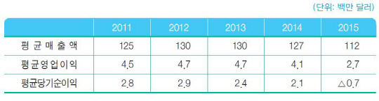 평균 영업이익은 2009년 이후 지속적으로 증가해오다 2012·2013년 470만달러를 기록했다. 그러나 2014년 410만달러로 떨어졌고 지난해에는 글로벌 수요부진에 따른 매출 급감 등의 영향으로 전년 대비 34.1% 감소한 270만 달러를 나타냈다.