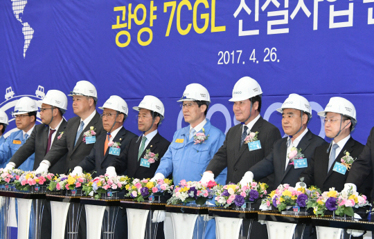 포스코 No.7 CGL 준공식에 참석한 권오준 포스코 회장과 내빈들이 스위칭 세레모니를 하고 있다. 좌측 두 번째부터 야마자키 르노닛산 부장, 카미시마 토요타 실장, 송재천 광양시의회 의장, 정인화 의원(국민의당), 권오준 포스코 회장(가운데), 이낙연 전라남도지사, 정현복 광양시장, 서명진 현대기아차 전무, 김영석 한국지엠 전무.