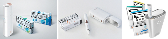 왼쪽부터 KT&G의 궐련형 전자담배 '릴'과 전용담배 '핏', 필립모리스의 '아이코스'와 전용담배 히츠, BAT코리아의 '글로'와 전용담배 던힐 네오스틱.