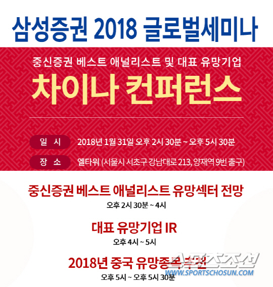 2부에는 미국 CES에도 참가한 AI 음성인식 서비스 기업 '아이플라이텍', 중국 신재생 에너지 선도 기업인 '보리협흠에너지'의 IR 담당자가 직접 방한해 기업을 소개한다. 3부에는 삼성증권 차이나센터 김미선 연구위원이 2018년 중국 투자 유망종목에 대해 소개할 예정이다.