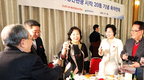 현대그룹 현정은 회장(가운데)이 지난 19일 금강산호텔 2층에서 열린 '금강산관광 20주년 기념식' 축하연회에서 건배사 후 건배를 하고 있다. 사진=현대그룹 제공
