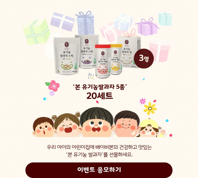 본죽이 만든 프리미엄 이유식 베이비본이 아이의 어린이집 등원을 준비하는 엄마들을 위해 '어린이집 아기과자 &간식 증정' 이벤트를 진행한다고 4일 밝혔다. 베이비본에 따르면 이벤트는 홈페이지를 통해 사연을 접수받고, 추첨을 통해 아이의 어린이집에 당첨자의 이름으로 '본 유기농 쌀과자 5종 20세트'를 제공한다.