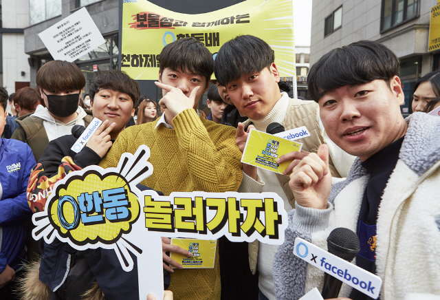 인기 유튜버 '보물섬'과 10대 고객들이 지난 2일 홍대 거리에서 페이스북 메신저 이벤트에 참여해 즐기고 있는 모습.