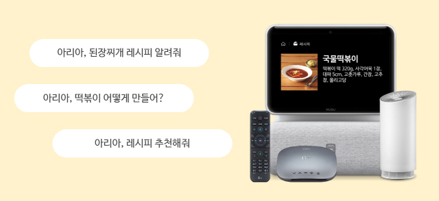 누구 레시피는 이용자가 "아리아, 레시피 추천해줘" 하면 발화 시각에 어울리는 요리 레시피를 랜덤으로 추천하고, "아리아, 갈비찜 레시피 알려줘" 하면 요리에 필요한 재료부터 단계 별로 레시피를 안내한다.
