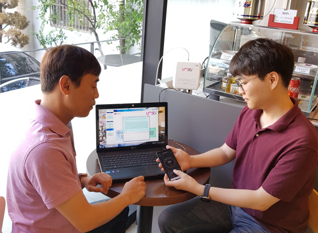 LG유플러스 직원과 디비콤 관계자가 5G 중계기를 설치하고 품질을 점검하고 있는 모습.