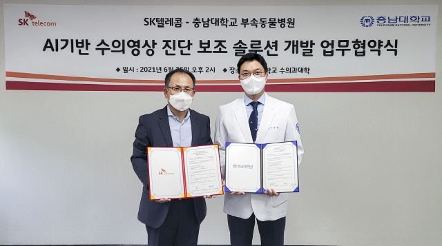 SK텔레콤이 충남대학교 수의과대학과 함께 'AI기반 수의 영상진단 보조 솔루션 개발을 위한 MoU'를 체결했다고 28일 밝혔다.