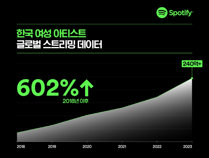 8일 스포티파이에 따르면 한국 여성 아티스트의 음악은 전 세계 이용자에게 사랑받으며 꾸준한 성장세를 기록한 것으로 나타났다. 지난해에만 전 세계적으로 한국 여성 아티스트가 스트리밍된 횟수는 240억 이상인 것으로 집계됐다. 2018년과 비교하면 602%가 늘었다.